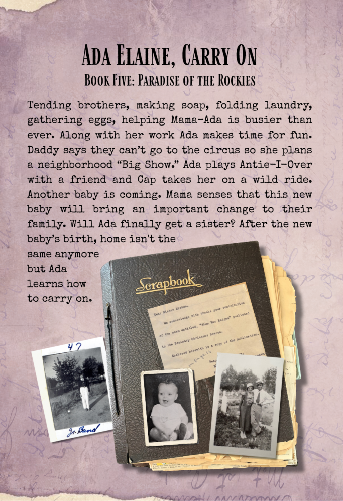 This book continues the true stories of Ada Elaine and her life on a dairy farm in Heber, Utah. The year is 1945, a year of change. It is a year of growth for Ada Elaine and a year of victory for the nation. Children and families alike will enjoy reading Ada Elaine, Victory Days; the fourth book in the Paradise of the Rockies series. (2015)